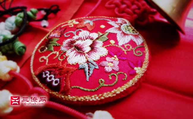 明清时,荷包有时也叫“茄袋”“顺袋”。如《金瓶梅》第三回写:“西门庆便向茄袋里取出(银子>来,约有一两一块,递于王婆子,交备办酒食。”这是沿按宋朝人的叫法。《宋史·舆服志》谓:“金主法物有玉带及皮茄袋。”又如小说《歧路灯》第二十四回写:“绍闻从顺袋掏出一封书子,递于夏逢若。”那是把荷包叫顺袋了。经过上千年的演化,荷包变得越来越精巧,样式、质地也丰富多样。有用绞、罗、绸、缎等上好的丝织品为面料的,有用羊皮、鹿皮缝作的,花样有用刺绣、纳纱、堆续等方法描绘的,形状有“葫芦”“鸡心”“圆形”等。《旧都文物略》称:“荷包巷所卖官样九件,压金刺锦,花样万千。”荷包和香囊一样,一般都出自女性之手,姑娘们将自己的情意密密地缝进了荷包里。如《红楼梦》,对荷包这个小物件常有描写,第十八回写元妃回家省亲,听龄官唱《相约》《相骂》二出戏,甚喜,于是“额外赏了两匹宫绸,两个荷包,并金银裸子之类”。第十七回,说宝玉在大观园被贾政试才题对额得了“头彩”,小厮们要赏,“一个个都上来解荷包,解扇袋,不容分说,将宝玉所佩之物,尽行解去”。从后文来看,小厮们抢去的大约是挂在宝玉腰间的荷包,而黛玉赠他的那个荷包,则是系在里面衣襟上的,所以没被抢走。但宝玉回房后,黛玉却以为被抢走了,因向宝玉道:“我给你的那个荷包也给了他们了?你明儿再想我的东西,可不能够了。”说毕,赌气回房。黛玉对自己送给宝玉的荷包很看重,因为这精巧的荷包可不是当做一般礼物送的。而宝玉也将这个充满情意的荷包妥帖地放在贴身处。