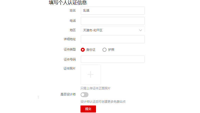 6、填写认证信息。输入姓名,地址,身份证号码,上传身份证正面照片,照片必须文字清晰。(如果怕泄露隐私,可以网上找假的身份证,本人试过可行)点击提交,就ok