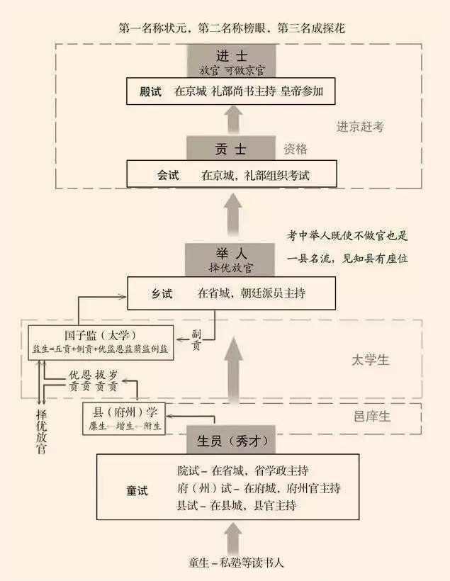 升级:童生试,是明清两代取得生员的入学考试,可分为县试、府试、院试。