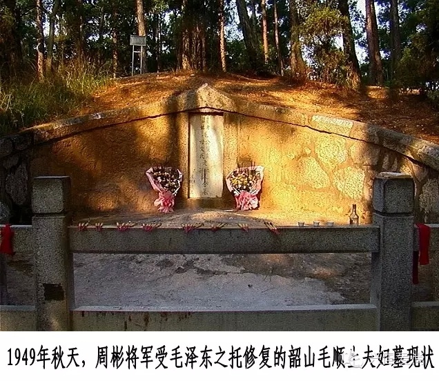 新中国成立后,周彬被授予解放军少将军衔。1990年,周彬将军曾将其为毛顺生夫妇修坟的情况,写了一个回忆录寄回家乡。我在整理兴国将军传时,看过这份回忆录。2006年9月中旬,我也曾专程驾摩托车去韶山考察过周彬建的毛顺生夫妇墓。墓距韶山毛泽东故居约一华里,酉山卯向兼庚甲,墓旁有亭,置毛泽东祭母文碑。1959年毛泽东回到韶山后,再次对滴水洞祖坟进行整修。
